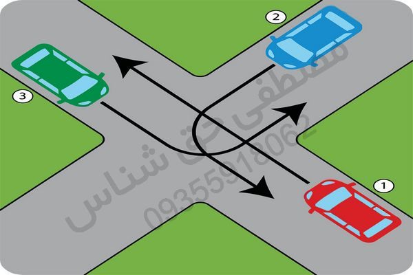 توضیح: در تقاطع هایی که تابلو ندارند حق تقدم ابتدا با وسیله نقلیه ای است که در سمت راست آن وسیله ای نیست پس در این تقاطع ابتدا خودرو سبز بعد خودرو آبی و در آخر خودرو قرمز