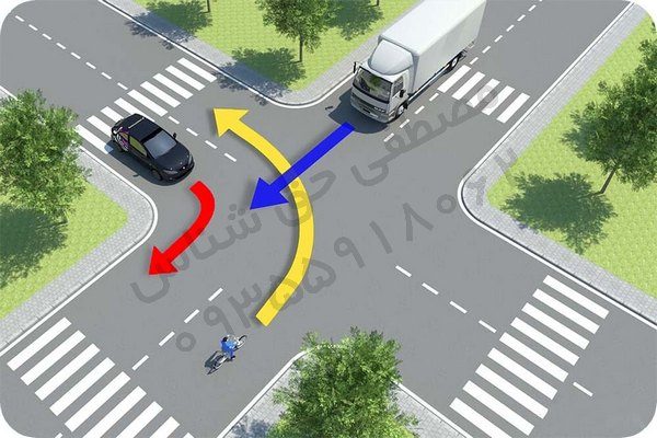 دلیل: در سه راهی مسیر تلاقی کننده ( در این تصویر همان خیابانی که کامیون در آن است) خیابان فرعی محسوب می شود وباید آخر از همه در حق تقدم باشد.