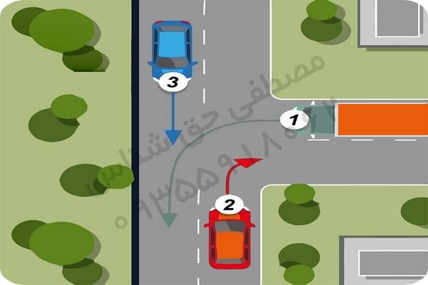 توضیح: در تقاطع هایی که تابلو ندارند حق تقدم ابتدا با وسیله نقلیه ای است که در سمت راست آن وسیله ای نیست پس در این تقاطع ابتدا دوچرخه بعد سواری و در آخر کامیون